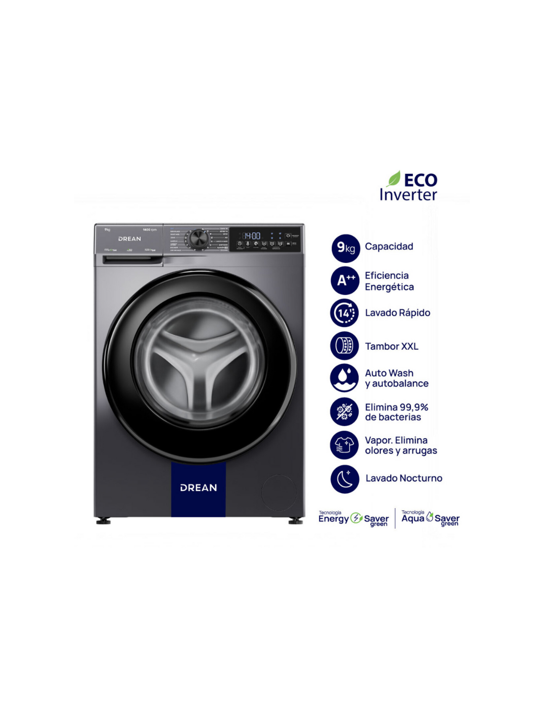 El Lavarropas Drean Inverter 9 Kg está diseñado para quienes buscan eficiencia, silencio y un lavado de calidad superior todos los días. Su motor Eco Inverter reduce vibraciones y ruido mientras optimiza el consumo, logrando un funcionamiento estable y duradero que cuida tu bolsillo y tu ropa.